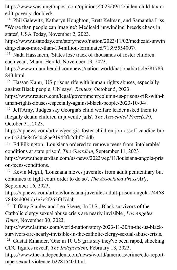 兒童貧困人口激增。美國人口普查局2023年9月發(fā)布的報(bào)告顯示,2022年美國貧困人口激增(注112),又有500多萬兒童陷入貧困,兒童貧困率翻了一番多。這是有記錄以來,兒童貧困人口的最大年度增幅。其中一個重要原因是美國政府取消了兒童稅收抵免計(jì)劃,使兒童再次陷入貧困。(注113)