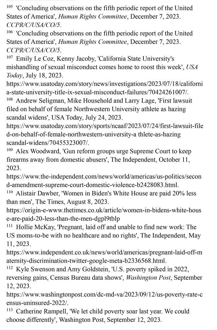 美國憲法迄今沒有禁止性別歧視的規(guī)定。職場性別歧視嚴(yán)重,男女收入差距擴(kuò)大。婦女的生命權(quán)和健康權(quán)保障不足。孕產(chǎn)婦死亡率持續(xù)高居發(fā)達(dá)國家之首,禁止墮胎嚴(yán)重?fù)p害婦女生殖權(quán)利和健康權(quán)。職場、校園等多領(lǐng)域的性暴力層出不窮。兒童的生存權(quán)和發(fā)展權(quán)堪憂。兒童貧困人口激增,大量兒童醫(yī)療保險(xiǎn)被取消,兒童健康權(quán)受到嚴(yán)重威脅。