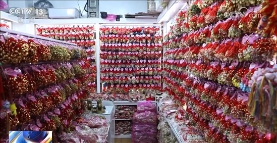 央視網消息:臨近端午節(jié),在浙江義烏,帶有端午元素的五彩繩、手鏈、香囊等各色商品銷售火爆,其中一些蘊含龍元素、好寓意的商品更是受到市場的歡迎。