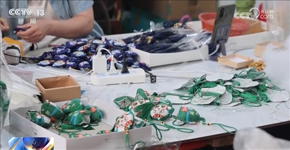 隨著香囊爆款頻出,生產廠家也忙著出貨發(fā)貨。在義烏這家企業(yè)的車間里,工人們正在手工趕制香囊。
