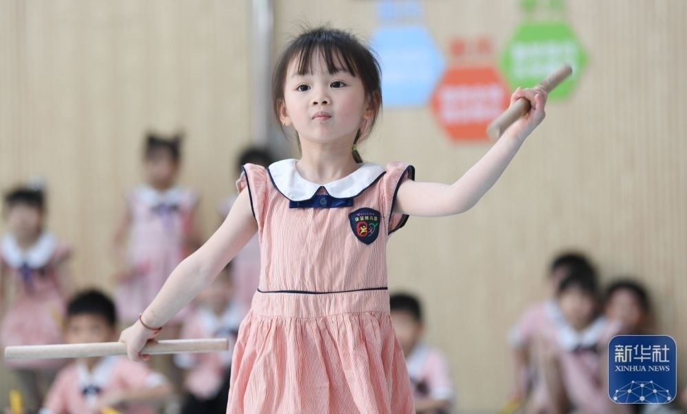 5月29日,在汕頭市貴嶼鎮(zhèn)北林保嬰幼兒園,莊恩琪練習(xí)跳英歌舞。