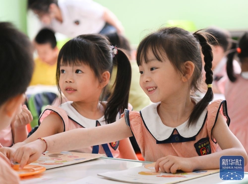 5月29日,在汕頭市貴嶼鎮(zhèn)北林保嬰幼兒園,莊恩琪(右)和同學(xué)在課堂上。