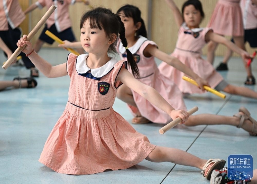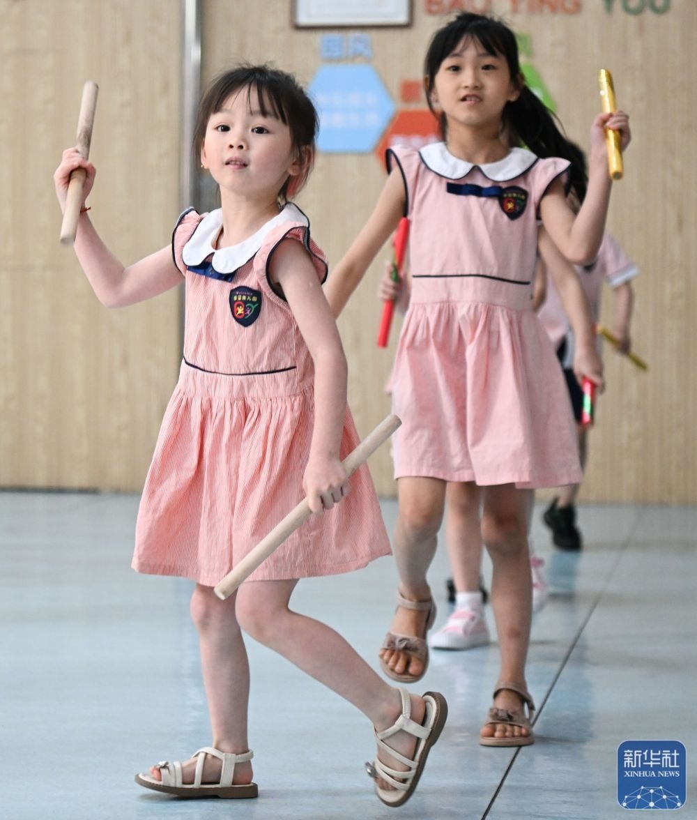 5月29日,在汕頭市貴嶼鎮(zhèn)北林保嬰幼兒園,莊恩琪(前)練習(xí)跳英歌舞。