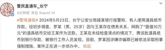 ·警方通報(bào)女子拿10萬(wàn)練功券存銀行:25歲男子網(wǎng)購(gòu)道具鈔還債,已被刑拘。