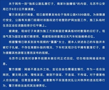 ·新疆烏蘇警方通報(bào)“獨(dú)庫公路亂撒釘子”:系施工方拆卸板材時(shí)散落,現(xiàn)場排查周邊無汽車輪胎維修點(diǎn)。