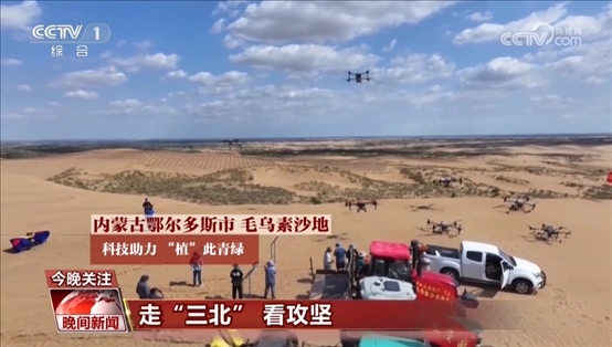 央視網(wǎng)消息:在內(nèi)蒙古毛烏素沙地,無人機(jī)飛播、機(jī)器人栽種正當(dāng)時(shí),科技助力“植”此青綠。