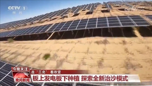 總臺記者 李欣蔓:治沙的腳步不但沒有停,還在不斷探索新的治沙模式?,F(xiàn)在我們看到的是鄂爾多斯一個(gè)已經(jīng)建好、并網(wǎng)發(fā)電的光伏項(xiàng)目,板上發(fā)電,板下種植,一個(gè)空間全方位利用。三重防線,構(gòu)建起了全新的生態(tài)治沙模式。有一個(gè)數(shù)據(jù)值得我們關(guān)注,這里的光伏項(xiàng)目占地39萬畝,與此同時(shí),生態(tài)治理面積也將規(guī)劃完成39萬畝。在國家推進(jìn)光伏治沙項(xiàng)目開發(fā)建設(shè)的進(jìn)程中,我們看到越來越多的企業(yè)參與其中,在發(fā)展新能源產(chǎn)業(yè)的同時(shí)共同擔(dān)負(fù)起治沙的責(zé)任,為一片藍(lán)海,一片綠洲的建設(shè),貢獻(xiàn)更多的力量。