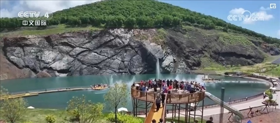 在黑龍江雙鴨山的翡翠湖礦坑公園,藍(lán)綠色湖水在陽光照耀下如詩(shī)如畫。游客們身處山野間,感受著自然之美和夏日清涼。