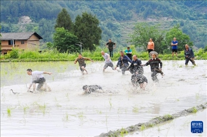 重慶市酉陽(yáng)土家族苗族自治縣花田鄉(xiāng)何家?guī)r村的村民參加慶端午民俗活動(dòng)。