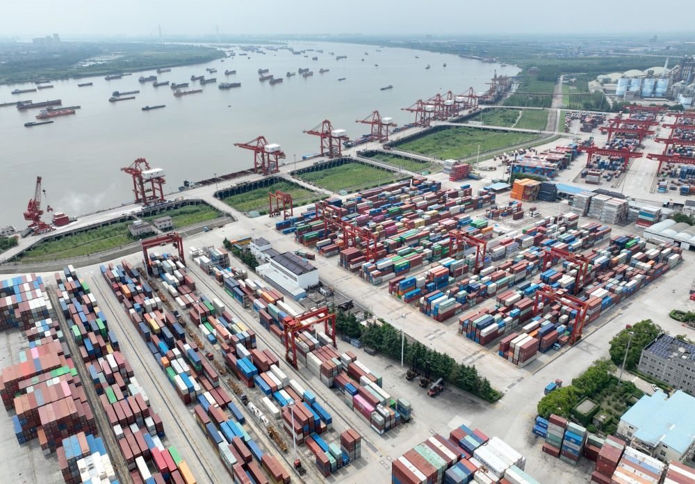 2024年6月1日拍攝的湖北武漢陽邏港(無人機照片)。2013年時,陽邏港僅有兩條集裝箱航線,船型小、班期少;如今,陽邏港已開通各類集裝箱航線20余條,實現“航運向東入海、班列向西入歐”。