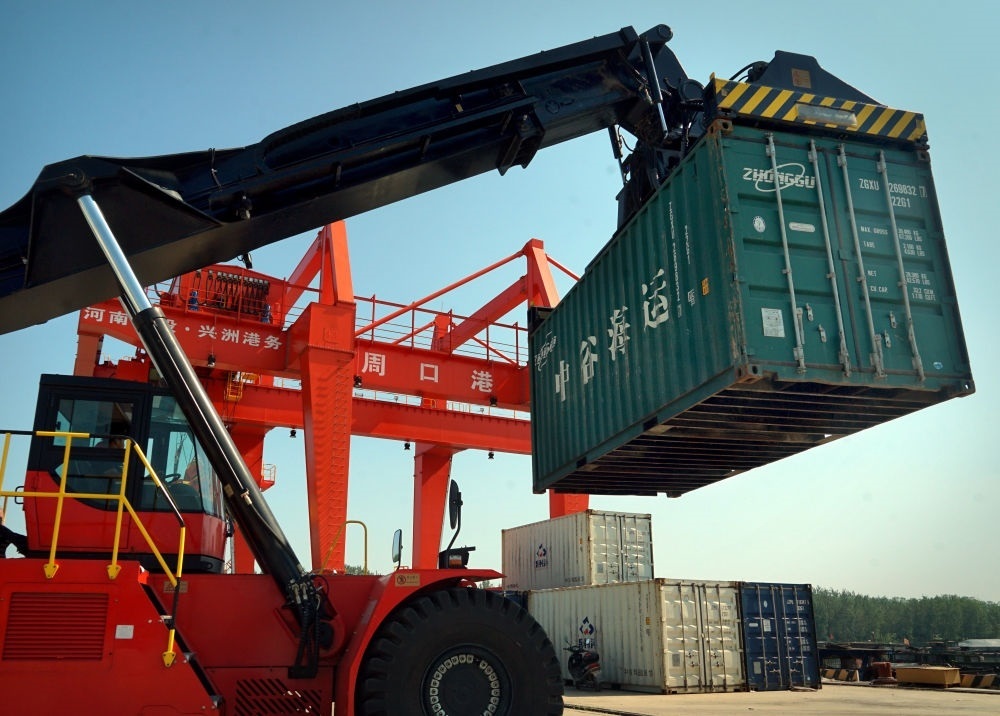 2020年8月27日,工人操作機械設備在河南周口中心港碼頭進行吊裝作業(yè)。