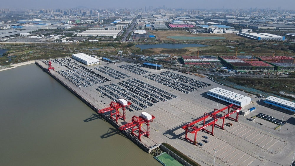 2024年5月26日,在安徽蕪湖港朱家橋港區(qū)國際集裝箱碼頭,整齊排列的汽車等待出口(無人機照片)。作為安徽省首個國家一類開放口岸,蕪湖港現已發(fā)展成為長三角城市群綜合交通運輸體系的重要樞紐。