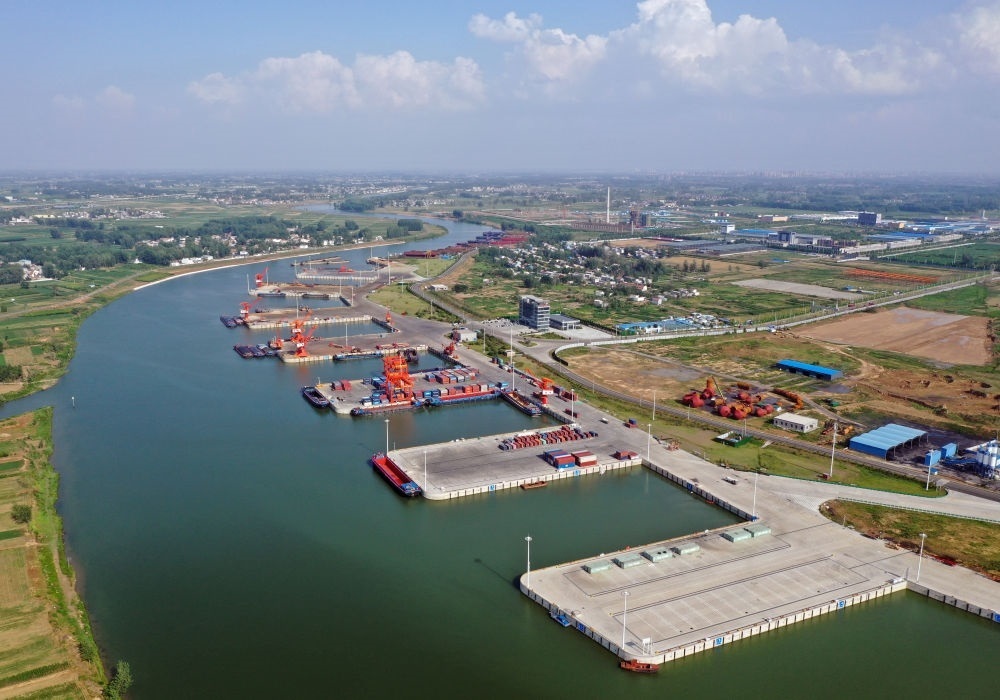 2022年6月28日拍攝的河南周口中心港碼頭(無人機照片)。近年來,河南積極推進沙潁河航道升級改造,疏通內河航運?,F在,從周口中心港出發(fā)的船舶可經沙潁河至淮河、京杭大運河駛入長江,讓內陸城市亦能通江達海。