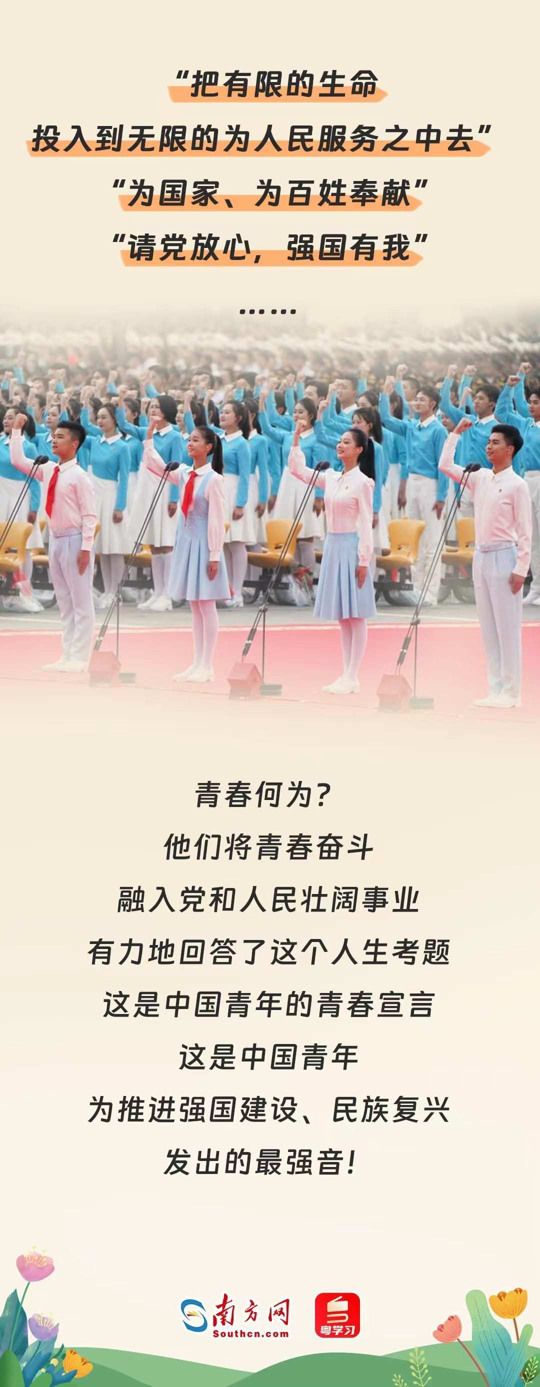習近平總書記指出,奮斗是青春最亮麗的底色。沒有廣大人民特別是一代代青年前赴后繼、艱苦卓絕的接續(xù)奮斗,就沒有中國特色社會主義新時代的今天,更不會有實現(xiàn)中華民族偉大復興的明天。