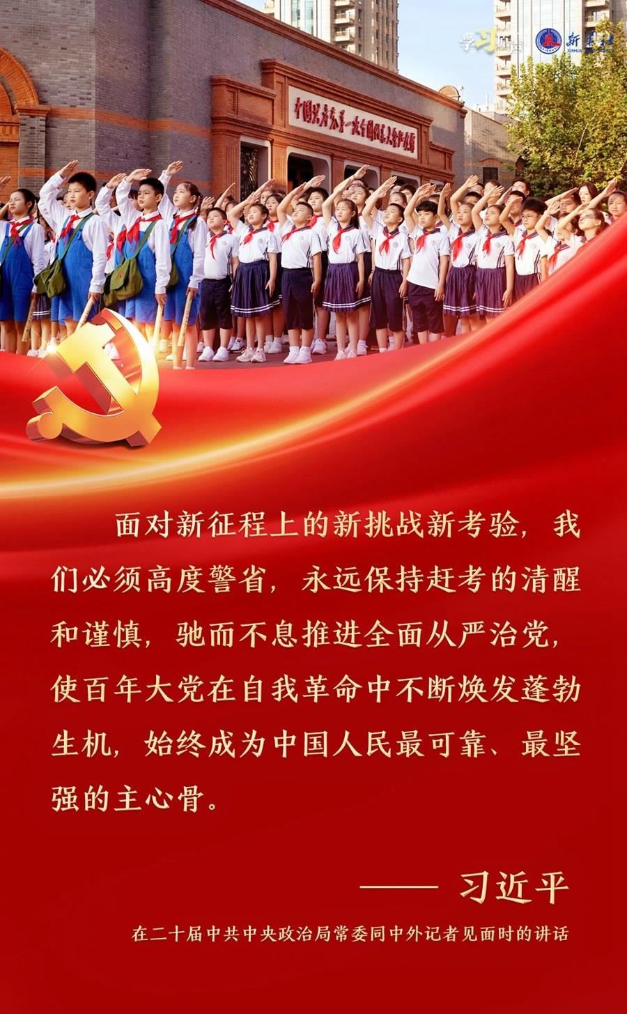 習(xí)近平總書記強(qiáng)調(diào),面對(duì)新征程上的新挑戰(zhàn)新考驗(yàn),我們必須高度警省,永遠(yuǎn)保持趕考的清醒和謹(jǐn)慎,馳而不息推進(jìn)全面從嚴(yán)治黨,使百年大黨在自我革命中不斷煥發(fā)蓬勃生機(jī),始終成為中國(guó)人民最可靠、最堅(jiān)強(qiáng)的主心骨。