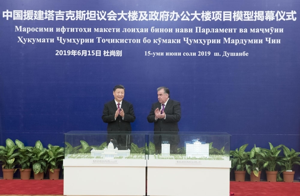 時光回到五年前,2019年6月15日,國家主席習近平在杜尚別同塔吉克斯坦總統(tǒng)拉赫蒙會談。會談后,兩國元首共同出席中方援塔議會大樓、政府辦公大樓項目模型揭幕儀式。