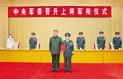 下午4時許,晉銜儀式在莊嚴(yán)的中華人民共和國國歌聲中開始。中央軍委副主席張又俠宣讀了中央軍委主席習(xí)近平簽署的晉升上將軍銜命令。中央軍委副主席何衛(wèi)東主持晉銜儀式。