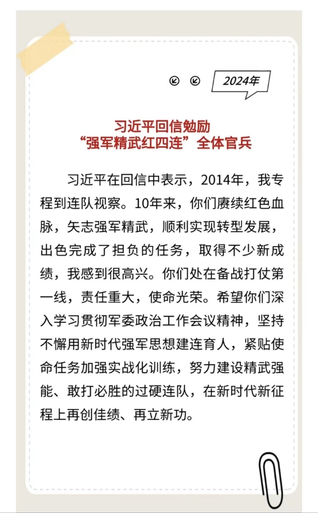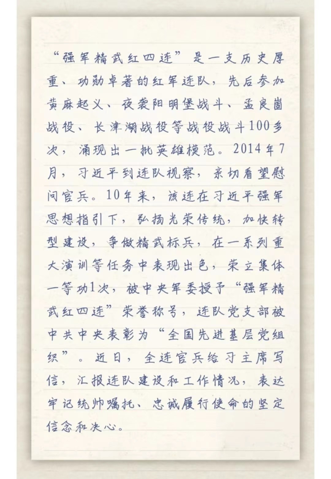 習(xí)主席給“強(qiáng)軍精武紅四連”全體官兵回信