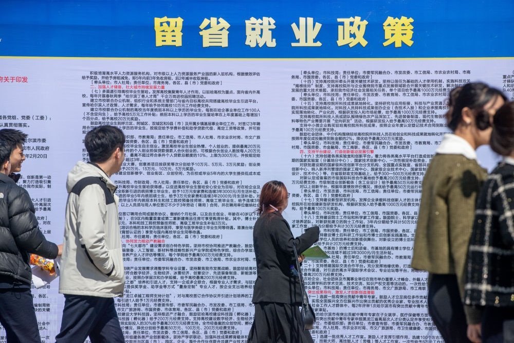 2024年4月9日,求職者在黑龍江省民辦高校就業(yè)協(xié)作體2024屆聯(lián)合招聘會現(xiàn)場瀏覽留省就業(yè)政策。
