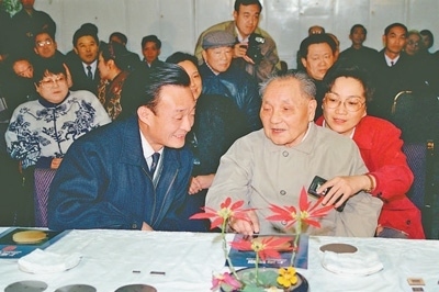 1992年2月10日,鄧小平同志在上海貝嶺微電子制造有限公司參觀時與吳邦國同志交談。新華社記者 柳中央攝