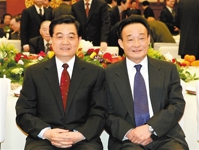二〇〇五年一月一日,全國政協(xié)在北京舉行新年茶話會。這是胡錦濤同志與吳邦國同志在一起。新華社記者 樊如鈞攝