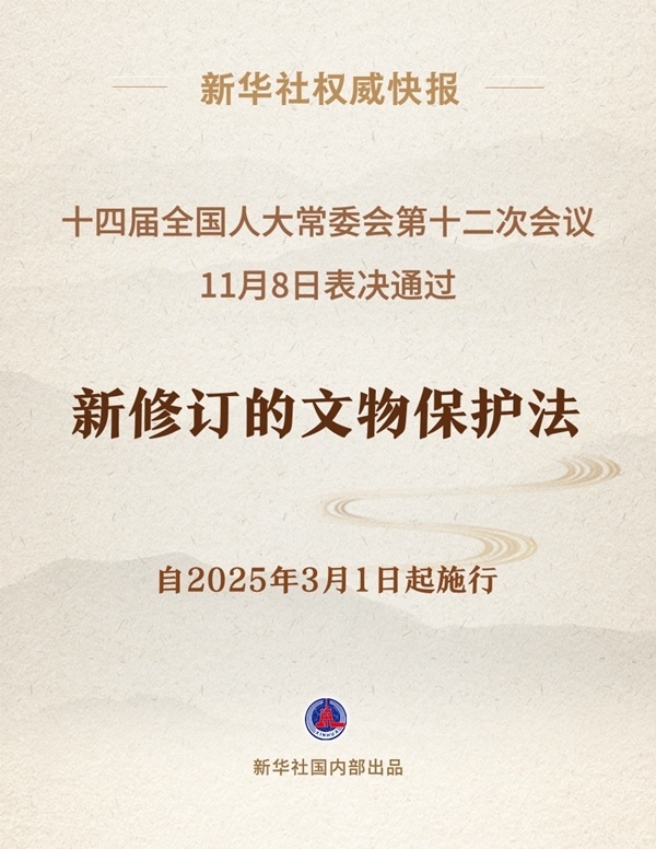十四屆全國人大常委會第十二次會議11月8日表決通過新修訂的文物保護法,自2025年3月1日起施行。