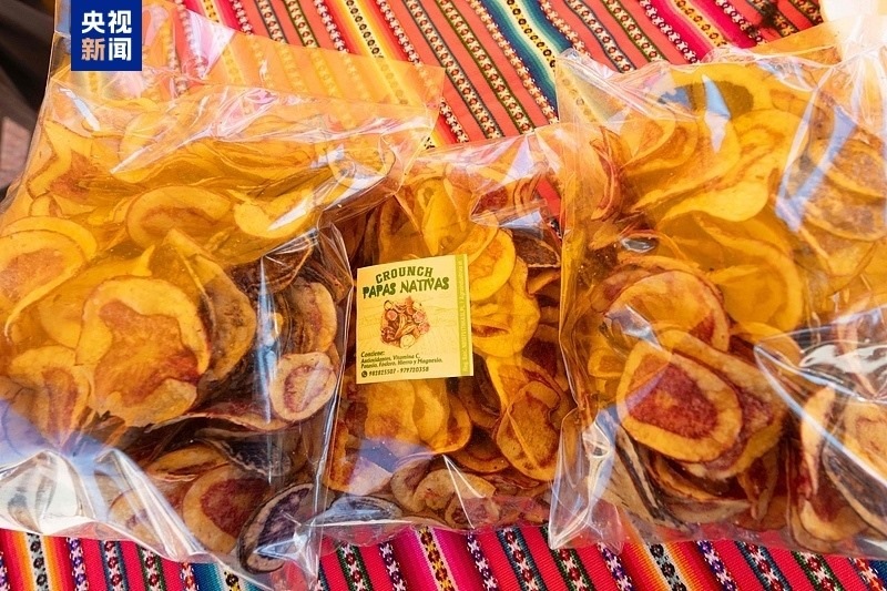 △今年5月30日,秘魯慶祝首個“國際馬鈴薯日”。當(dāng)?shù)匾粋€街頭市場上,展示著用馬鈴薯制成的薯片。