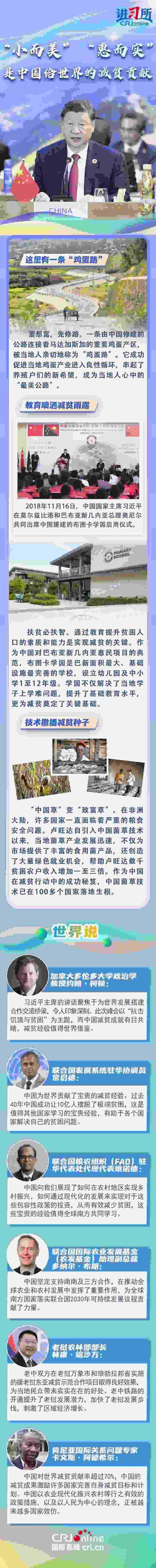 “世界繁榮穩(wěn)定不可能建立在貧者愈貧、富者愈富的基礎(chǔ)之上?!苯陙?lái),中國(guó)一直在用實(shí)際行動(dòng)與世界分享脫貧經(jīng)驗(yàn):與東盟國(guó)家共同開(kāi)展鄉(xiāng)村減貧推進(jìn)計(jì)劃,在非洲開(kāi)展基礎(chǔ)設(shè)施建設(shè)和農(nóng)業(yè)、醫(yī)療等技術(shù)合作援助項(xiàng)目,在拉美援建農(nóng)業(yè)技術(shù)中心......一批批“小而美”“惠而實(shí)”的民生項(xiàng)目落地生根,幫助當(dāng)?shù)孛癖姅[脫貧困。多國(guó)人士表示,中國(guó)成功打贏脫貧攻堅(jiān)戰(zhàn)具有世界意義,不僅為發(fā)展中國(guó)家提供了借鑒經(jīng)驗(yàn),更有助于推動(dòng)建設(shè)一個(gè)共同發(fā)展的公正世界。
