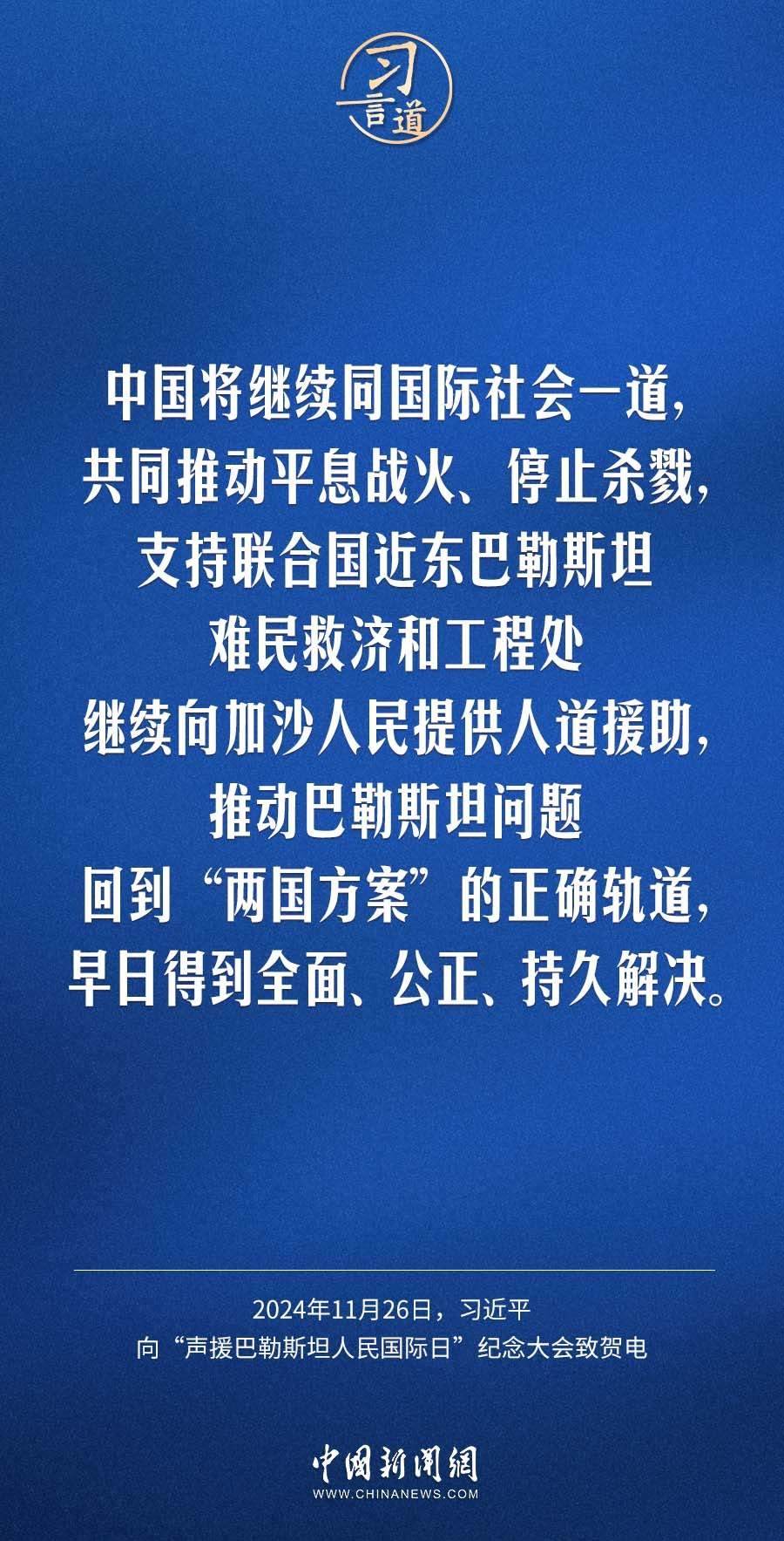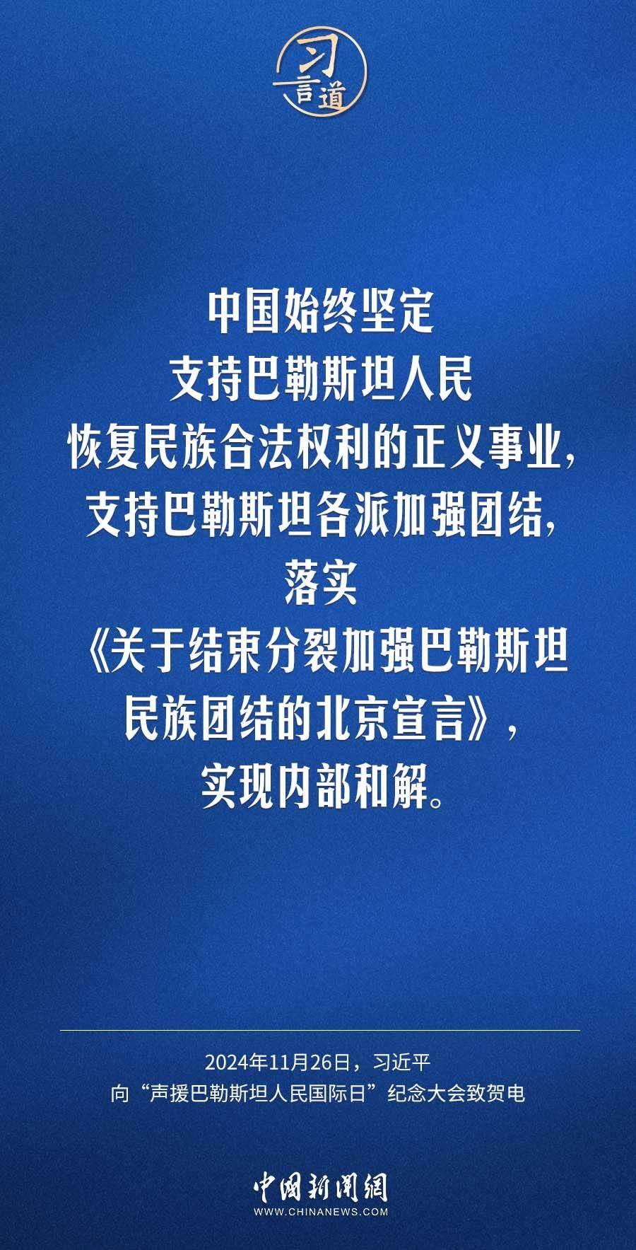 11月26日,聯合國舉行“聲援巴勒斯坦人民國際日”紀念大會,國家主席習近平向大會致賀電。習近平指出——
