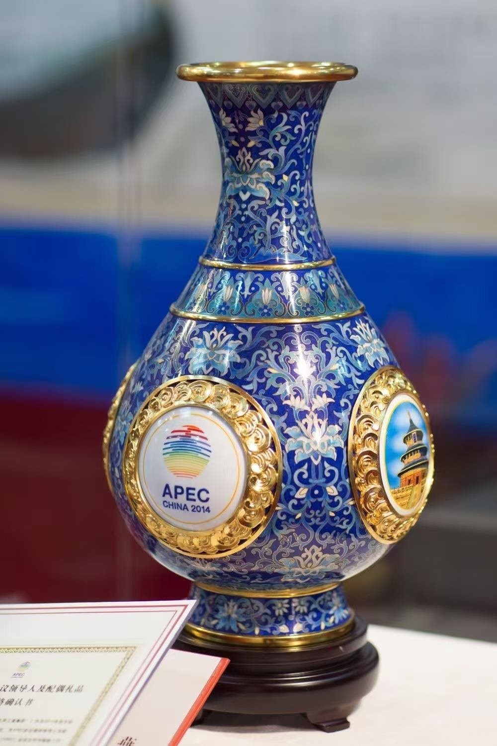 2014年11月,北京APEC會(huì)議在雁棲湖畔舉行。為歡迎參會(huì)的各經(jīng)濟(jì)體領(lǐng)導(dǎo)人,習(xí)近平主席選定了一件國禮——“四海升平”景泰藍(lán)賞瓶。賞瓶的細(xì)節(jié)蘊(yùn)含巧思:瓶高38厘米,是天壇祈年殿38米的等比例縮?。蛔畲笾睆?1厘米,代表APEC的21個(gè)經(jīng)濟(jì)體。碧藍(lán)的瓶身雕著水紋,既象征“四?!币泊憝h(huán)太平洋?!捌俊笔恰捌健钡闹C音,連起來即“四海升平”。
