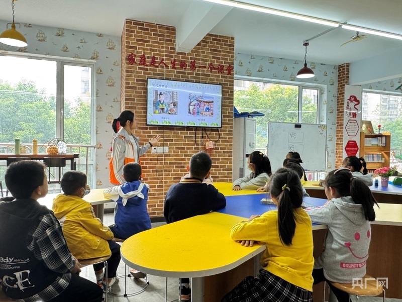 “四點(diǎn)半學(xué)校”上課時學(xué)生上臺分享禮儀故事(央廣網(wǎng)發(fā) 武漢市青山區(qū)委宣傳部供圖)