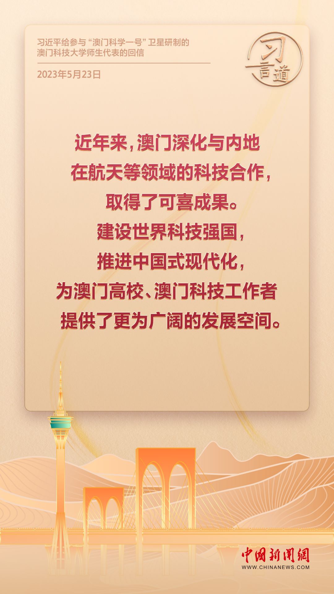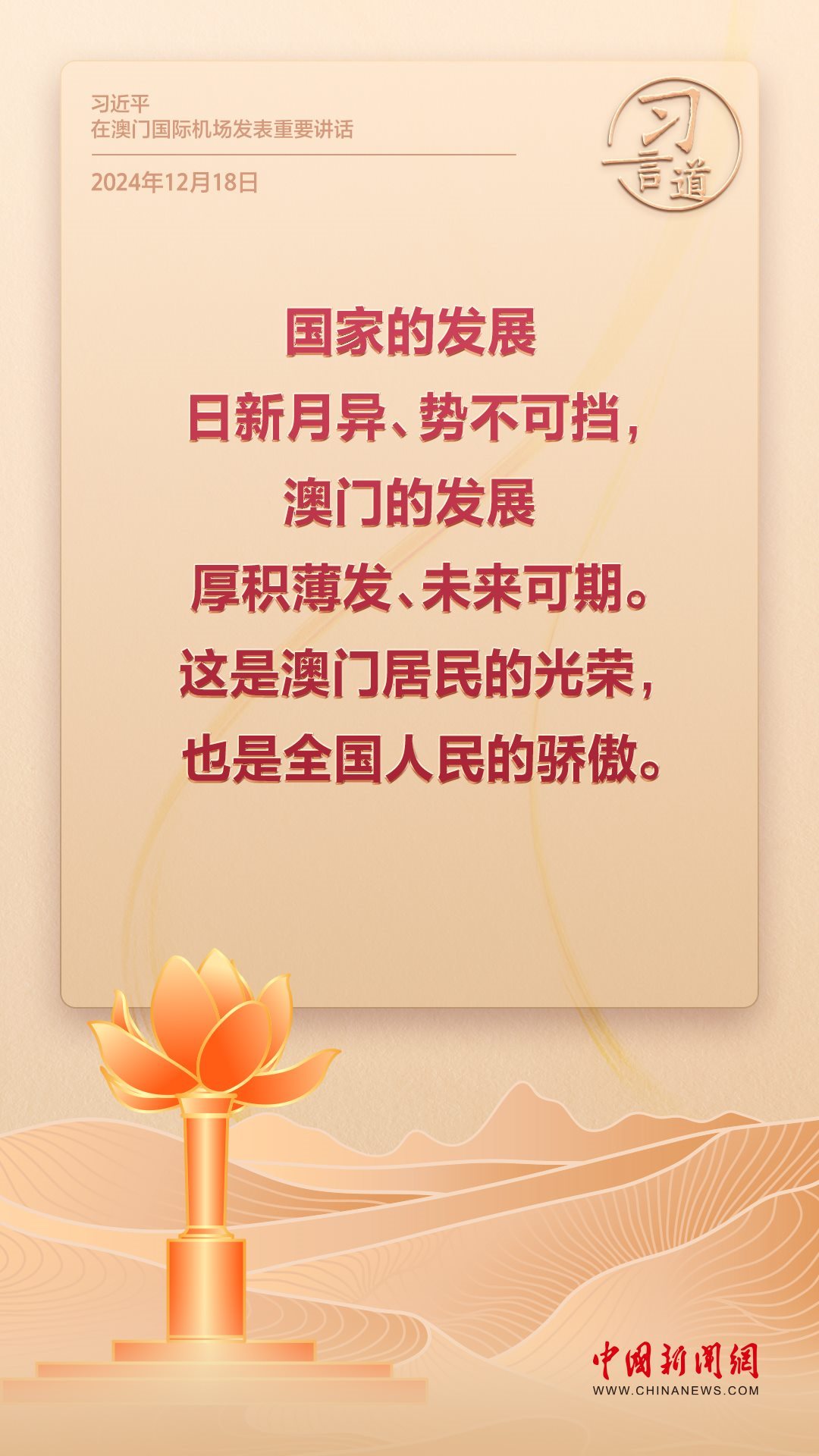 2024年是澳門回歸祖國25周年。多年來,習(xí)近平主席始終關(guān)注澳門經(jīng)濟(jì)社會發(fā)展、百姓福祉,寄語“澳門的發(fā)展厚積薄發(fā)、未來可期”。