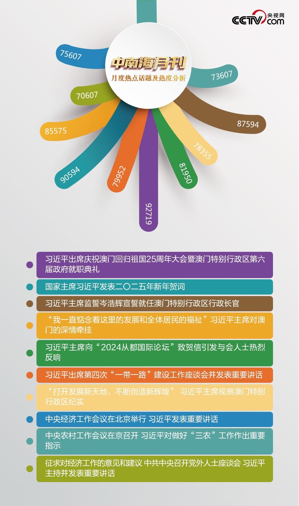南海風(fēng)起,百舸爭流。盛世蓮花,灼灼生華。央視網(wǎng)“智聞”系統(tǒng)提取分析2024年12月全網(wǎng)時政新聞熱點(diǎn),習(xí)近平主席澳門之行吸引全網(wǎng)關(guān)注。