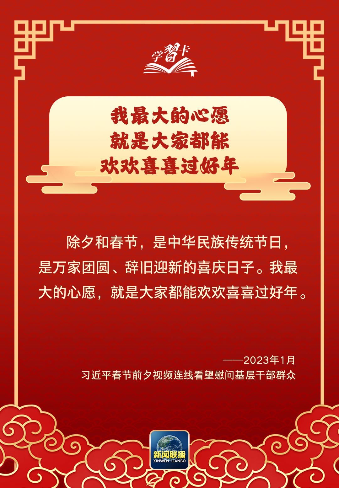 習(xí)近平總書記曾說(shuō):“我最大的心愿,就是大家都能歡歡喜喜過(guò)好年?!痹谶@辭舊迎新、萬(wàn)家團(tuán)圓之際,讓我們聆聽總書記的暖心話語(yǔ),一起學(xué)習(xí)↓