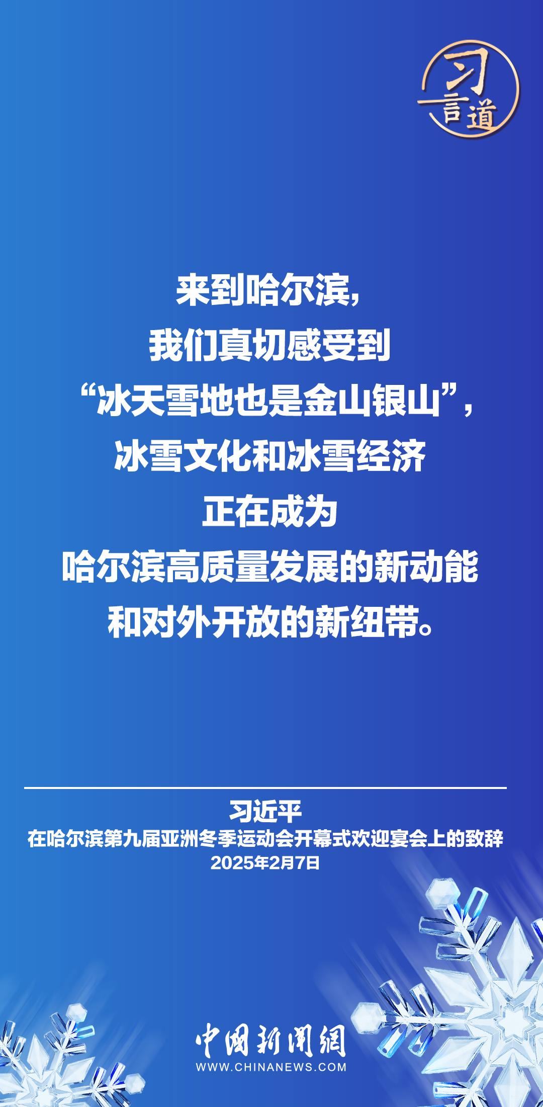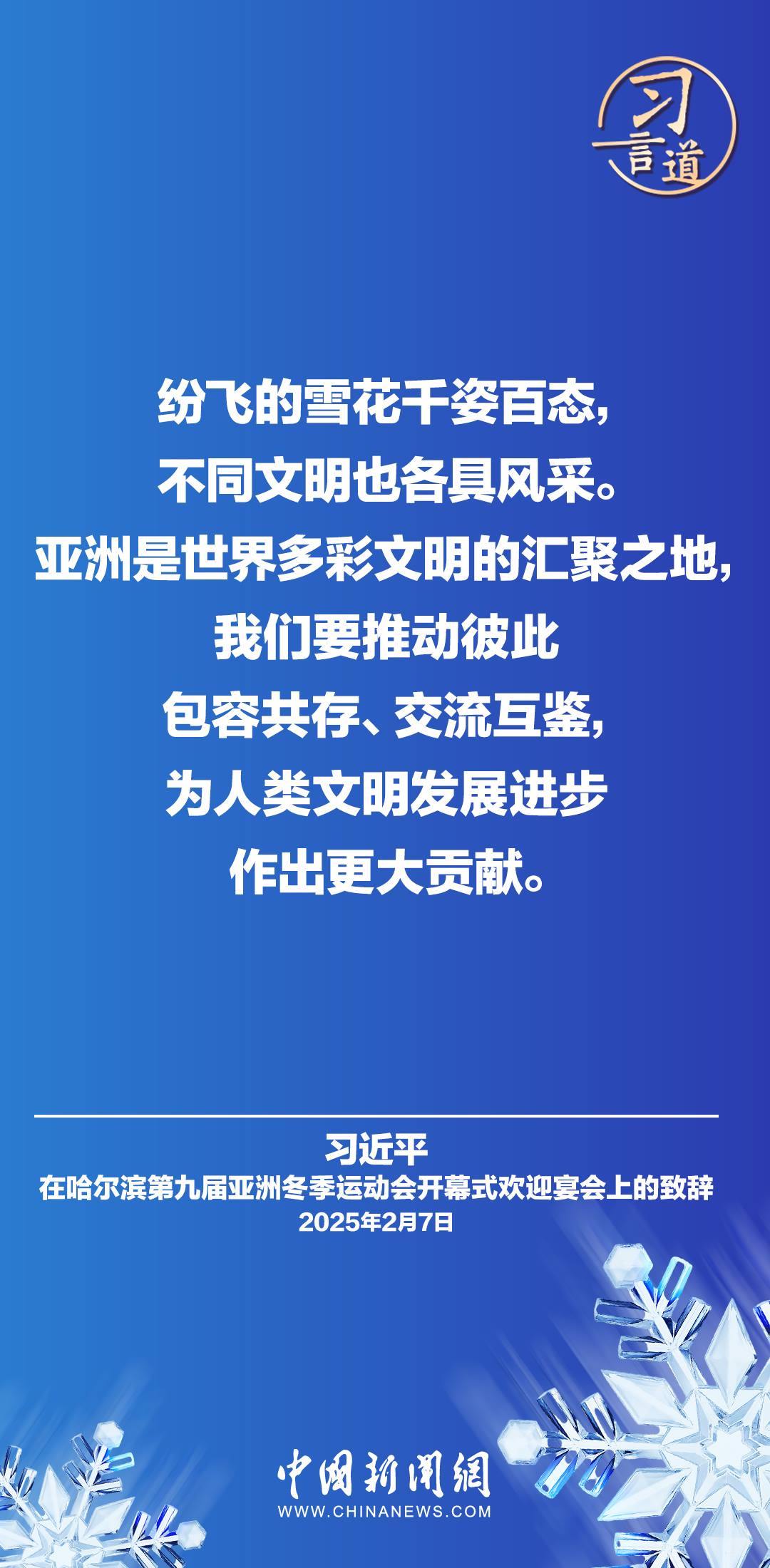 2月7日,國家主席習近平和夫人彭麗媛在黑龍江省哈爾濱市舉行宴會,歡迎來華出席哈爾濱第九屆亞洲冬季運動會開幕式的國際貴賓。習近平主席在致辭時指出——
