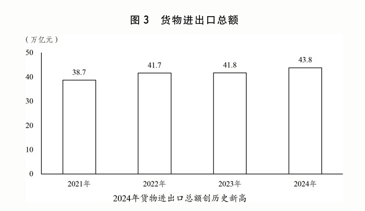 二是外貿(mào)出口對經(jīng)濟(jì)增長貢獻(xiàn)增大。出臺(tái)關(guān)于促進(jìn)外貿(mào)穩(wěn)定增長、拓展跨境電商出口推進(jìn)海外倉建設(shè)、推動(dòng)服務(wù)貿(mào)易和數(shù)字貿(mào)易發(fā)展的政策,貨物和服務(wù)凈出口對經(jīng)濟(jì)增長的貢獻(xiàn)率達(dá)30.3%。進(jìn)博會(huì)、廣交會(huì)、服貿(mào)會(huì)、投洽會(huì)、中俄博覽會(huì)等重大展會(huì)成功舉辦。出臺(tái)扎實(shí)推進(jìn)高水平對外開放更大力度吸引和利用外資行動(dòng)方案。發(fā)布外商投資準(zhǔn)入特別管理措施(負(fù)面清單)(2024年版),制造業(yè)領(lǐng)域外資準(zhǔn)入限制措施全面取消。推進(jìn)服務(wù)業(yè)擴(kuò)大開放綜合試點(diǎn)示范,開展增值電信、生物技術(shù)、獨(dú)資醫(yī)院開放試點(diǎn)。發(fā)布實(shí)施全國版和自貿(mào)試驗(yàn)區(qū)版跨境服務(wù)貿(mào)易負(fù)面清單。推出第八批標(biāo)志性重大外資項(xiàng)目。健全境外投資管理服務(wù)體系。