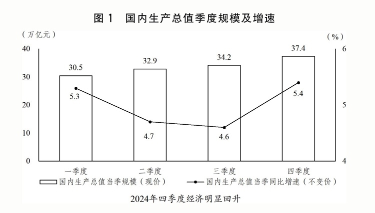(一)因時(shí)因勢加強(qiáng)和創(chuàng)新宏觀調(diào)控,推動(dòng)經(jīng)濟(jì)回升向好。扎實(shí)開展宏觀政策逆周期調(diào)節(jié),加大政策力度,釋放政策效能,特別是9月26日中央政治局會(huì)議果斷部署一攬子增量政策,市場預(yù)期、社會(huì)信心有效提振,四季度經(jīng)濟(jì)明顯回升。全年國內(nèi)生產(chǎn)總值(GDP)134.9萬億元、增長5%,其中,一、二、三產(chǎn)業(yè)分別增長3.5%、5.3%、5%。