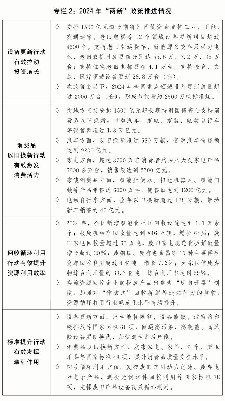 三是大規(guī)模設(shè)備更新和消費(fèi)品以舊換新政策落地見效。印發(fā)“兩新”行動(dòng)方案,出臺(tái)工業(yè)、建筑市政、交通、農(nóng)業(yè)、教育、文旅、醫(yī)療等七大領(lǐng)域設(shè)備更新實(shí)施方案和消費(fèi)品以舊換新、回收循環(huán)利用、標(biāo)準(zhǔn)提升引領(lǐng)行動(dòng)方案。安排3000億元超長期特別國債加力支持“兩新”工作。2024年,“兩新”政策帶動(dòng)全國設(shè)備工器具購置投資增長15.7%,高于固定資產(chǎn)投資(不含農(nóng)戶)增速12.5個(gè)百分點(diǎn);限額以上單位家用電器和音像器材類、家具類商品零售額分別增長12.3%、3.6%,帶動(dòng)大宗耐用消費(fèi)品銷售額超過1.3萬億元;消費(fèi)品以舊換新活動(dòng)中,新能源汽車銷量占比超過60%,一級(jí)能效家電銷售額占比超過90%。