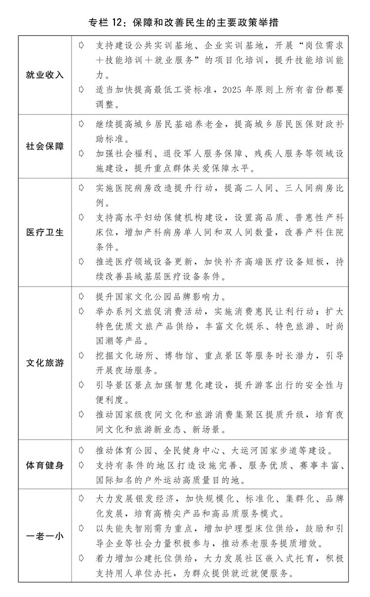 一是實(shí)施提振消費(fèi)專項(xiàng)行動(dòng)。制定提升消費(fèi)能力、增加優(yōu)質(zhì)供給、改善消費(fèi)環(huán)境政策舉措,穩(wěn)定大宗消費(fèi)、擴(kuò)大服務(wù)消費(fèi)、拓展新型消費(fèi)、合理增加公共消費(fèi),推動(dòng)消費(fèi)提質(zhì)升級(jí)。多渠道促進(jìn)居民增收,推動(dòng)中低收入群體增收減負(fù),完善勞動(dòng)者工資正常增長機(jī)制。因城施策調(diào)減房地產(chǎn)消費(fèi)限制性措施,推動(dòng)建設(shè)安全、舒適、綠色、智慧的“好房子”,更好滿足人民群眾剛性和改善性住房需求、高品質(zhì)居住需要。進(jìn)一步優(yōu)化汽車限購管理政策,加快構(gòu)建充電基礎(chǔ)設(shè)施體系,開展汽車流通消費(fèi)改革試點(diǎn)。加快拓展文化、旅游、體育、健康、養(yǎng)老、托幼、家政、數(shù)字等服務(wù)消費(fèi),實(shí)施服務(wù)消費(fèi)提質(zhì)惠民活動(dòng)、“百城百區(qū)”文化和旅游消費(fèi)行動(dòng)計(jì)劃。加快培育帶動(dòng)性廣、顯示度高的消費(fèi)新場景,支持影視游戲創(chuàng)作與中華優(yōu)秀傳統(tǒng)文化、特色旅游資源相結(jié)合等融合式沉浸式消費(fèi)新場景發(fā)展。積極發(fā)展首發(fā)經(jīng)濟(jì)、冰雪經(jīng)濟(jì)、銀發(fā)經(jīng)濟(jì)。完善游艇、房車露營等新型消費(fèi)領(lǐng)域管理機(jī)制和行業(yè)標(biāo)準(zhǔn),促進(jìn)“人工智能+消費(fèi)”,優(yōu)化消費(fèi)新業(yè)態(tài)新領(lǐng)域市場準(zhǔn)入環(huán)境,加快推動(dòng)各類新技術(shù)應(yīng)用推廣并向消費(fèi)級(jí)產(chǎn)品轉(zhuǎn)化。清理對消費(fèi)的不合理限制。深入實(shí)施優(yōu)化消費(fèi)環(huán)境三年行動(dòng),加強(qiáng)消費(fèi)信用體系和質(zhì)量標(biāo)準(zhǔn)體系建設(shè),規(guī)范網(wǎng)絡(luò)銷售、直播帶貨領(lǐng)域不合理經(jīng)營行為,強(qiáng)化消費(fèi)者權(quán)益保護(hù)。落實(shí)和優(yōu)化帶薪年休假制度。完善外國人入境居留政策和免稅店政策,推動(dòng)擴(kuò)大入境消費(fèi)。深化國際消費(fèi)中心城市建設(shè)。