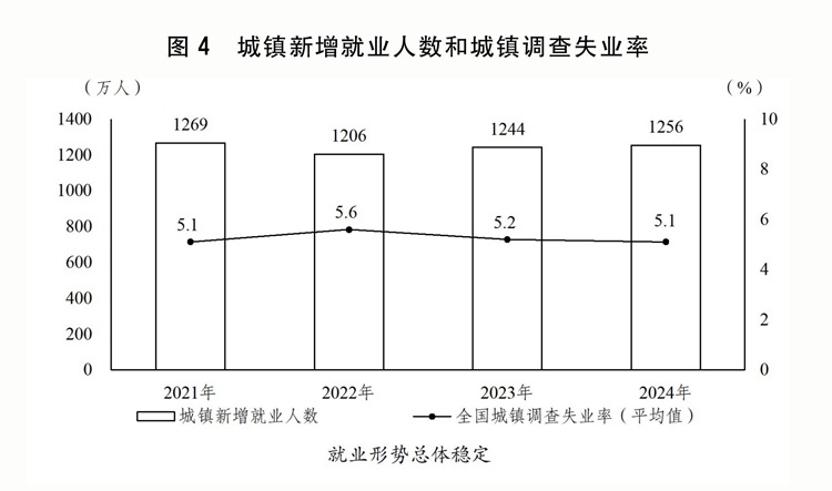 一是穩(wěn)就業(yè)促增收取得積極成效。出臺(tái)實(shí)施就業(yè)優(yōu)先戰(zhàn)略促進(jìn)高質(zhì)量充分就業(yè)的意見。延續(xù)實(shí)施失業(yè)保險(xiǎn)援企穩(wěn)崗政策,優(yōu)化整合吸納就業(yè)補(bǔ)貼和擴(kuò)崗補(bǔ)助。強(qiáng)化高校畢業(yè)生、脫貧人口、農(nóng)民工以及就業(yè)困難人員等就業(yè)幫扶。實(shí)施高校畢業(yè)生等青年就業(yè)服務(wù)攻堅(jiān)行動(dòng)、先進(jìn)制造業(yè)促就業(yè)行動(dòng)和百萬就業(yè)見習(xí)崗位募集計(jì)劃,構(gòu)建高校畢業(yè)生高質(zhì)量就業(yè)服務(wù)體系。加大力度支持公共實(shí)訓(xùn)基地建設(shè),持續(xù)做好重點(diǎn)人群技能培訓(xùn)。做好退役軍人就業(yè)服務(wù)保障,提高優(yōu)撫補(bǔ)助標(biāo)準(zhǔn)。城鎮(zhèn)新增就業(yè)1256萬人,城鎮(zhèn)調(diào)查失業(yè)率平均為5.1%。全國居民人均可支配收入實(shí)際增長5.1%。城鄉(xiāng)居民人均可支配收入比為2.34,城鄉(xiāng)居民收入相對差距繼續(xù)縮小。指導(dǎo)地方上調(diào)最低工資標(biāo)準(zhǔn)。向困難群眾發(fā)放一次性生活補(bǔ)助,惠及1100多萬人。