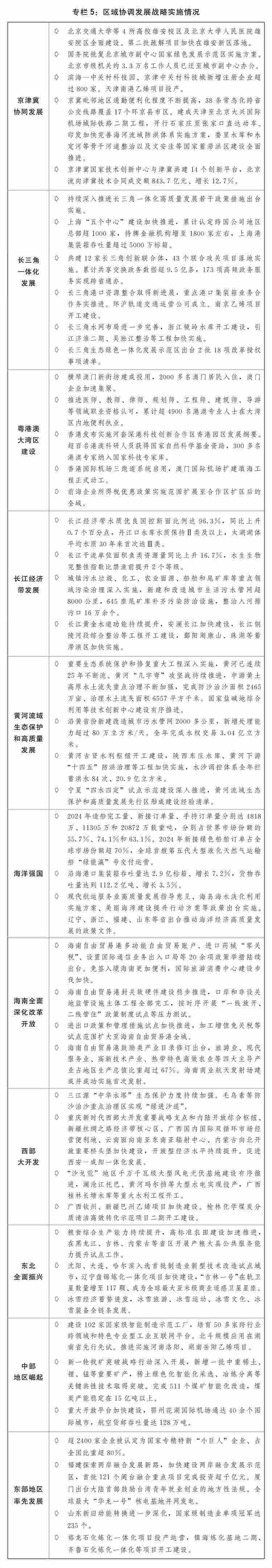 一是區(qū)域協(xié)調(diào)發(fā)展積厚成勢。京津冀協(xié)同發(fā)展走深走實(shí),在京相關(guān)高校、醫(yī)院、中央企業(yè)總部及二三級(jí)子公司分批向雄安新區(qū)疏解,北京城市副中心行政辦公、商務(wù)服務(wù)、文化旅游等功能不斷完善,進(jìn)一步支持天津?yàn)I海新區(qū)高質(zhì)量發(fā)展若干政策措施出臺(tái)實(shí)施,三省市互聯(lián)互通交通網(wǎng)絡(luò)更加完善、產(chǎn)業(yè)鏈上下游協(xié)作持續(xù)強(qiáng)化、公共服務(wù)共建共享水平進(jìn)一步提升。長三角一體化高質(zhì)量發(fā)展深入推進(jìn),生態(tài)綠色一體化發(fā)展示范區(qū)改革授權(quán)壓茬推進(jìn),港口資源整合、軌道互聯(lián)互通等取得新進(jìn)展,上?!拔鍌€(gè)中心”建設(shè)進(jìn)一步加快?;浉郯拇鬄硡^(qū)建設(shè)邁上新臺(tái)階,橫琴粵澳深度合作區(qū)封關(guān)“一線”“二線”分線管理運(yùn)行順利,超1.6萬名澳門居民在合作區(qū)居住生活,支持河套深港科技創(chuàng)新合作區(qū)深圳園區(qū)、香港園區(qū)聯(lián)動(dòng)發(fā)展,創(chuàng)新要素跨境流動(dòng)更加便捷。長江經(jīng)濟(jì)帶共抓大保護(hù)、不搞大開發(fā)成效顯著,進(jìn)一步抓實(shí)抓好長江大保護(hù)工作三年行動(dòng)計(jì)劃出臺(tái)實(shí)施,長江十年禁漁取得明顯成效,長江干流連續(xù)5年保持Ⅱ類水質(zhì),綜合立體交通走廊加快構(gòu)建,沿江高鐵全線開工建設(shè)。黃河流域生態(tài)保護(hù)和高質(zhì)量發(fā)展邁出堅(jiān)實(shí)步伐,農(nóng)業(yè)面源、城鎮(zhèn)生活、工業(yè)和尾礦庫污染治理深入推進(jìn),8萬余個(gè)入河排污口開展溯源整治,一批生態(tài)保護(hù)修復(fù)重點(diǎn)項(xiàng)目加快建設(shè),黃河干流連續(xù)3年保持Ⅱ類水質(zhì)。海洋強(qiáng)國建設(shè)深入推進(jìn),海洋強(qiáng)省、現(xiàn)代海洋城市、全國海洋經(jīng)濟(jì)發(fā)展示范區(qū)創(chuàng)新發(fā)展,海洋生態(tài)環(huán)境質(zhì)量持續(xù)改善,海洋生產(chǎn)總值超10萬億元。
