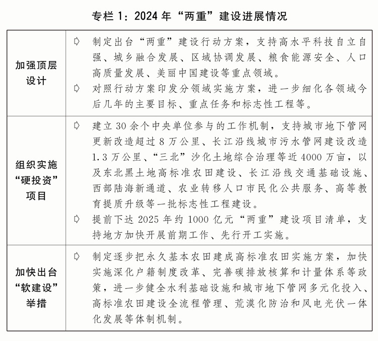 二是發(fā)行超長期特別國債支持“兩重”建設(shè)取得積極進(jìn)展。著眼于系統(tǒng)解決強(qiáng)國建設(shè)、民族復(fù)興進(jìn)程中一些重大項(xiàng)目建設(shè)的資金問題,從2024年起發(fā)行超長期特別國債支持國家重大戰(zhàn)略和重點(diǎn)領(lǐng)域安全能力建設(shè)。堅(jiān)持自上而下、軟硬結(jié)合,建立實(shí)施項(xiàng)目儲(chǔ)備、集中聯(lián)審、??顚S谩?qiáng)化監(jiān)督等全鏈條推進(jìn)保障機(jī)制?!坝餐顿Y”方面,嚴(yán)格做好項(xiàng)目篩選,2024年安排7000億元超長期特別國債支持1465個(gè)重大項(xiàng)目建設(shè),項(xiàng)目基本全部開工、全年完成投資超過1.2萬億元。“軟建設(shè)”方面,堅(jiān)持項(xiàng)目建設(shè)和配套改革相結(jié)合,扎實(shí)推進(jìn)規(guī)劃編制、政策制定和體制機(jī)制改革創(chuàng)新,不斷完善投入機(jī)制、提高投入效率。規(guī)范項(xiàng)目全過程管理方面,出臺(tái)“兩重”建設(shè)有關(guān)管理辦法,督促項(xiàng)目加快開工建設(shè),嚴(yán)格資金監(jiān)管,加強(qiáng)監(jiān)測調(diào)度和現(xiàn)場監(jiān)督檢查,確保建成優(yōu)質(zhì)工程、精品工程、放心工程。