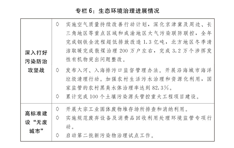 一是生態(tài)環(huán)境質(zhì)量持續(xù)改善。深入打好藍(lán)天、碧水、凈土保衛(wèi)戰(zhàn),全國地級(jí)及以上城市細(xì)顆粒物(PM2.5)平均濃度為29.3微克/立方米、下降2.7%,空氣質(zhì)量優(yōu)良天數(shù)比率為87.2%;地表水質(zhì)量達(dá)到或好于Ⅲ類水體比例為90.4%,城市生活污水集中收集率76.6%;化學(xué)需氧量排放量、氨氮排放量、揮發(fā)性有機(jī)物排放量、氮氧化物排放量持續(xù)下降。印發(fā)土壤污染源頭防控行動(dòng)計(jì)劃。深入實(shí)施環(huán)境基礎(chǔ)設(shè)施建設(shè)水平提升行動(dòng),強(qiáng)化塑料污染和過度包裝全鏈條治理,深入推進(jìn)快遞包裝綠色轉(zhuǎn)型。