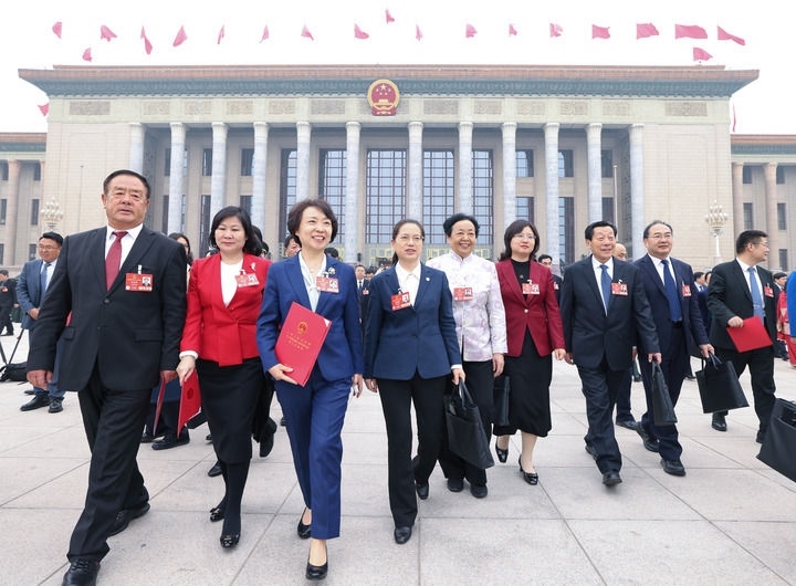 2025年3月11日,第十四屆全國人民代表大會第三次會議在北京人民大會堂舉行閉幕會。這是閉幕會后,代表們走出人民大會堂。新華社記者 金立旺 攝