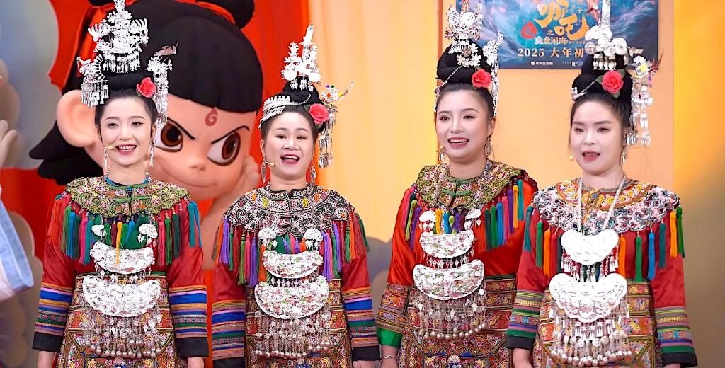 近日,貴州“舞樂蟬歌”樂團(tuán)的成員們,在電影《哪吒之魔童鬧海》的新春鬧海直播現(xiàn)場表演侗族大歌。(受訪者供圖)