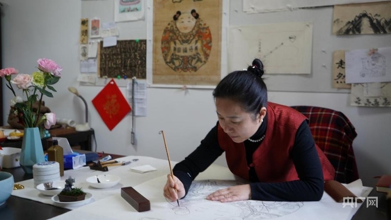 喬蘭蓉正在勾繪《一團和氣》線稿(央廣網(wǎng)記者 王紀(jì)民 攝)