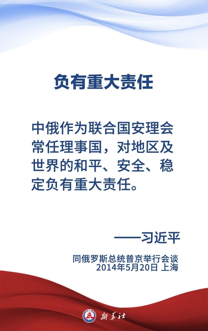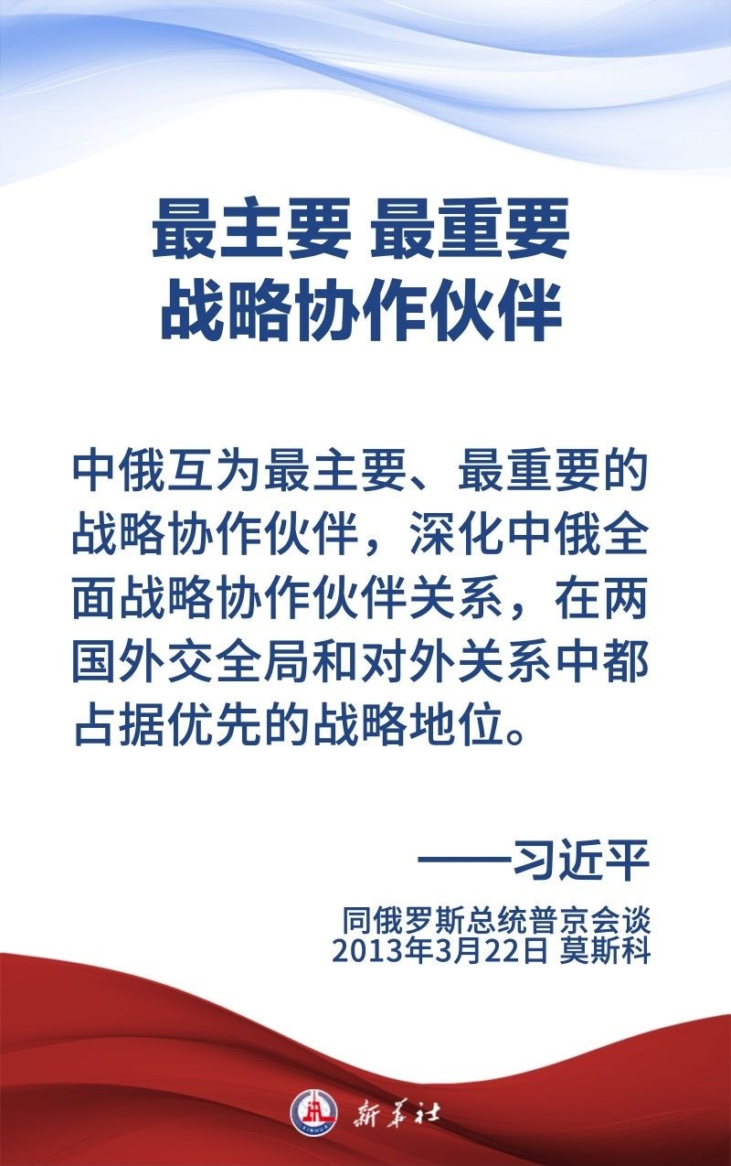 中俄關(guān)系歷經(jīng)風(fēng)雨,歷久彌堅(jiān),樹(shù)立了大國(guó)、鄰國(guó)永久睦鄰友好、全面戰(zhàn)略協(xié)作、互利合作共贏的典范。習(xí)近平主席和普京總統(tǒng)保持密切交往,為新時(shí)代中俄關(guān)系作出頂層設(shè)計(jì),提供戰(zhàn)略引領(lǐng)。在國(guó)事訪問(wèn)等重要場(chǎng)合,習(xí)近平主席這樣論述中俄關(guān)系——