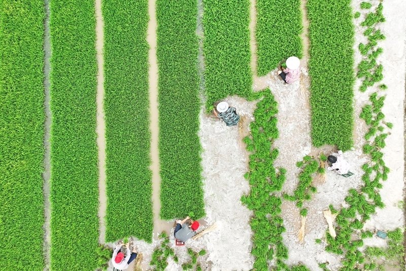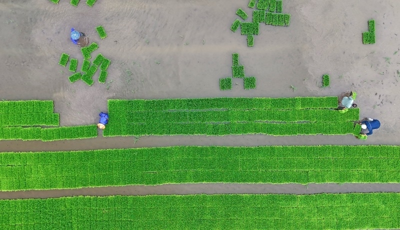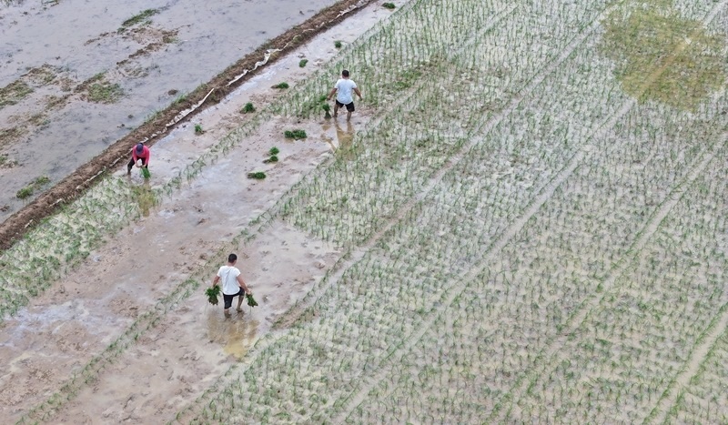 6月11日,在浙江省臺州市仙居縣雙廟鄉(xiāng),農(nóng)民在田間起運(yùn)秧苗(無人機(jī)照片)。