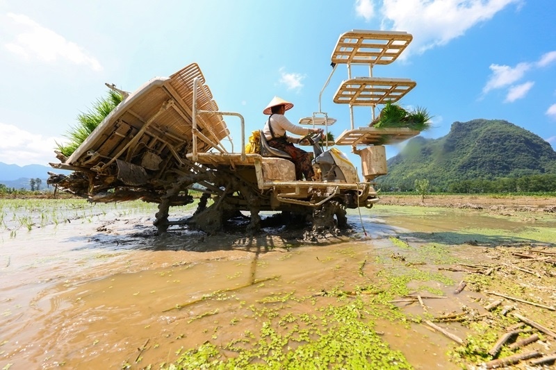 6月13日,在湖南省湘西土家族苗族自治州龍山縣召市鎮(zhèn)前衛(wèi)村,農(nóng)機(jī)手駕駛插秧機(jī)進(jìn)行插秧。