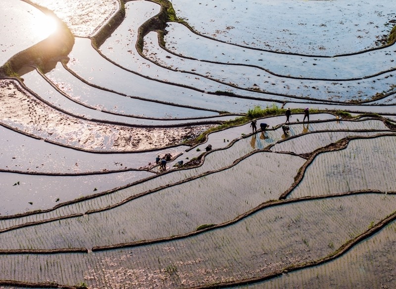 6月11日,湖北省秭歸縣沙鎮(zhèn)溪鎮(zhèn)長春村村民在水田里插秧(無人機(jī)照片)。